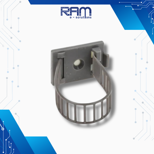 This fastener on this cable clamp simply wraps around the cable or conduit, and is threaded through a moulded eyelet on the clamp which holds it securely in place.
